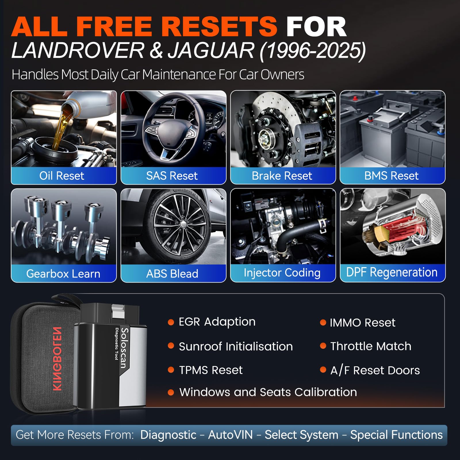 - 🛠️【50+ Reset Funktionen Lebenslanges Update】KINGBOLEN Soloscan obd2 Codeleser verfügt über 50+ Reset-Funktionen für Landrover und Jaguar Automodelle, einschließlich Öl-Reset, Scheinwerferanpassung, Entlüftungs-Reset, BMS-Reset, DPF-Reset, EGR-Lernen, Drosselklappen-Lernen, BMS-Reset, Inject-Reset, SAS-Reset und mehr. Es kann Ihnen erlauben, zurücksetzen und initialisieren Sie Ihr Fahrzeug-Systeme mühelos nach jeder Wartung und Reparatur; Holen Sie sich Quick Start:Diagnose--Wählen Sie Modus & Jahr--Wählen Sie System--Sonderfunktion.