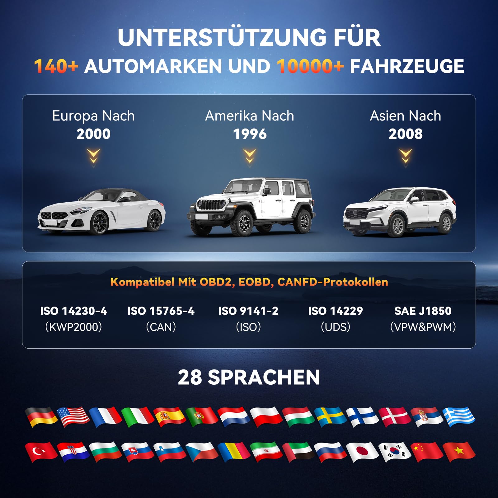 • 【Unterstützung Für 10000+ Automodelle】THINKSCAN 662 obd2 diagnosegerät Kompatibel mit den meisten US-Autos ab Baujahr 1996, bei EU-Autos ab Baujahr 2000 ,als auch bei Fahrzeugen, die in 2008 Asien gefertigt wurden. Unterstützt 140+ Automarken auf der ganzen Welt, funktioniert auf über 10000+ Automodellen.kompatibel mit OBD2, EOBD, CANFD-Protokoll.